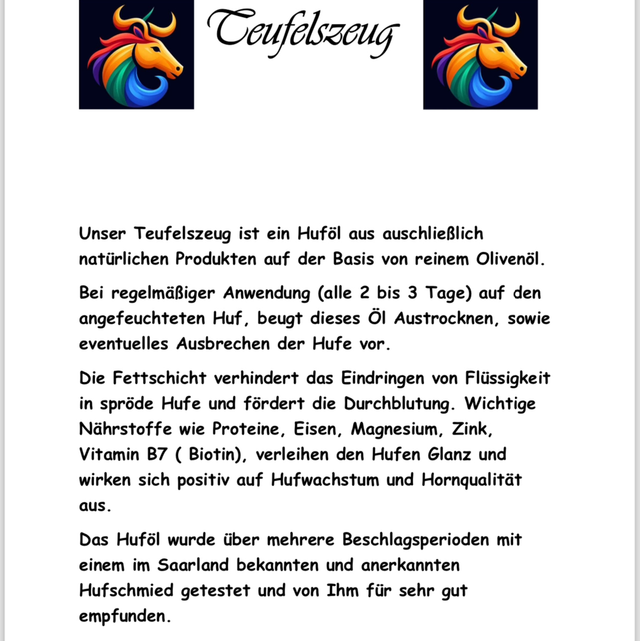 natürliches innovatives Huföl, entwickelt aus dem Profireitsport mit vielen natürlichen pflegenden Zutaten wie natives Olivenöl, Zwiebeln aus biologischem Anbau und dergleichen. Erhältlich ab 250ml bis 20l, größere Mengen und Palettenware auf Anfrage